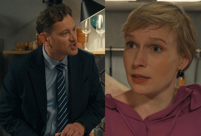 Robert Stefaniak (Paweł Ławrynowicz) w garniturze z krawatem, z wściekłością kłóci się z Sonią (Weronika Nockowska), która spogląda z przestrachem. Emocjonalna scena z serialu "Barwy szczęścia" dostępna na Super Seriale.