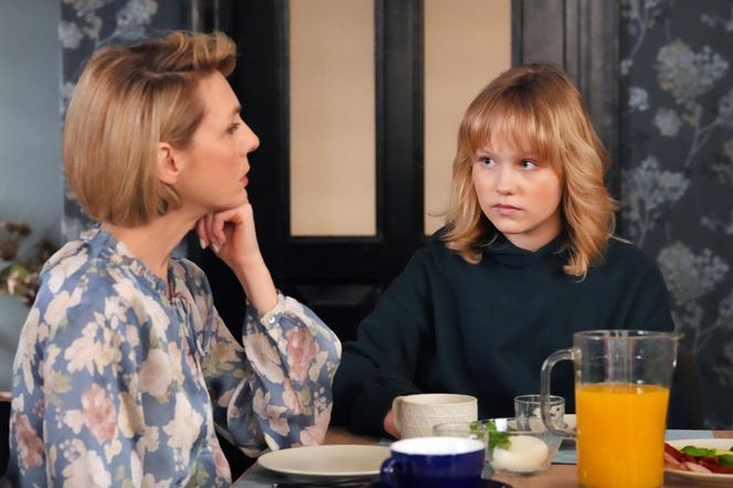 Aktorka Joanna Gleń jako Malwina w kwiecistej bluzce z blond włosami, trzymająca dłoń przy twarzy, oraz Jessica Frankiewicz jako Emilka w ciemnej bluzie, siedzące przy stole z sokiem pomarańczowym. Zdjęcie ilustruje scenę, o której przeczytasz więcej na portalu Super Seriale.