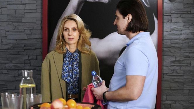 Malwina (Joanna Gleń) i Herman (Maciej Raniszewski) rozmawiają w fitness klubie. Malwina, ubrana w kwiecistą bluzkę i oliwkową marynarkę, patrzy z zaniepokojeniem. Herman, w jasnoniebieskiej koszulce, trzyma butelkę wody i ręcznik, opowiada o swoich planach, które wzbudzają jej obawy. Więcej informacji o serialu znajdziesz na stronie Super Seriale.