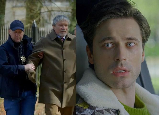 Podzielony kadr: po lewej mężczyzna w policyjnej czapce prowadzi starszego mężczyznę w płaszczu, symbolizując zatrzymanie Kiryłły. Po prawej, przerażony Cezary Rawicz z szeroko otwartymi oczami. Dowiedz się więcej o serialu "Barwy szczęścia" na portalu Super Seriale.