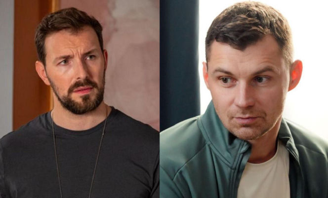 Zdjęcie przedstawia dwóch mężczyzn. Po lewej Darek (Andrzej Niemyt) z brodą i w czarnej koszulce. Po prawej Karol (Jan Wieczorkowski) w zielonej bluzie, patrzący w bok. Obaj wyglądają na zmartwionych, co pasuje do kontekstu artykułu o przesłuchaniu w sprawie zabójstwa Stefaniaka w "Barwach szczęścia" na Super Seriale.