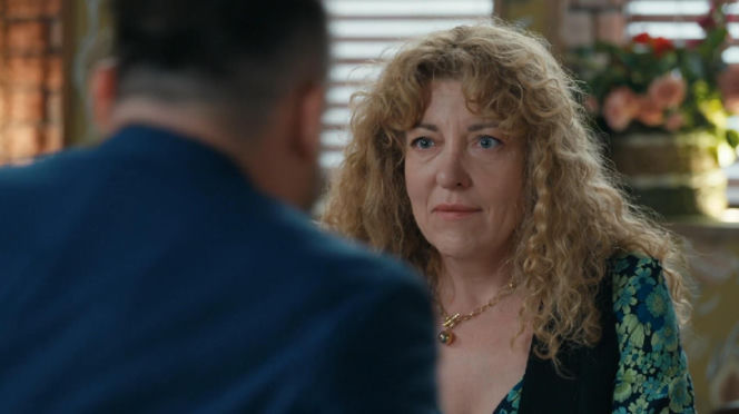 Hanna Klepacka jako Żabcia, patrząca na rozmówcę z roztargnieniem, z długimi, kręconymi blond włosami i delikatnym makijażem, w tle rozmazane kwiaty. Aktorka grająca Żabcię z serialu „Barwy Szczęścia” w rozmowie z Wilkiem. O fabule przeczytasz na stronie Super Seriale.