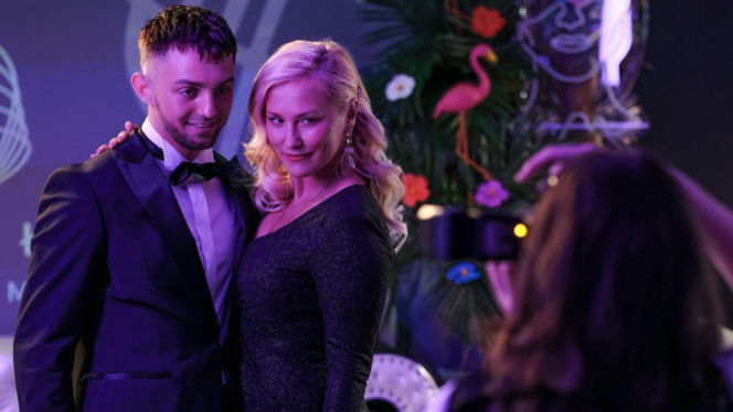 Justyna Zytko w ciemnej, błyszczącej sukience obejmująca młodego Mirka w smokingu na czerwonym dywanie, pozują do zdjęć na gali. Kobieta uśmiecha się do fotografa, a mężczyzna patrzy na nią z uśmiechem. Zdjęcie ilustruje relację bohaterów "Barw szczęścia", o której można przeczytać na Super Seriale.