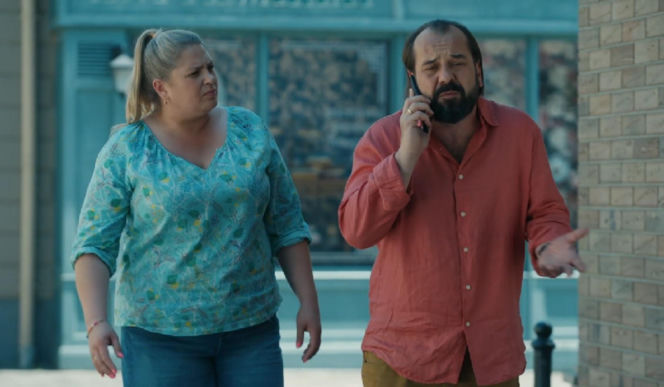 Aldona (Elżbieta Romanowska) i Borys (Jakub Wieczorek) Grzelakowie ze zmartwionymi minami na ulicy. Borys rozmawia przez telefon, gestykulując, a Aldona patrzy w bok z niezadowoleniem. To zdjęcie z serialu "Barwy szczęścia", a więcej o nim znajdziesz na Super Seriale.
