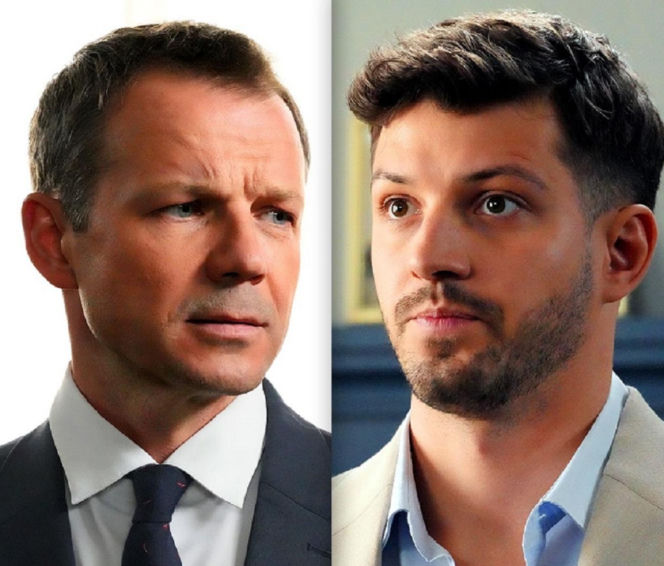 Portrety Bruna (Lesław Żurek) i Justina (Jasper Sołtysiewicz), patrzących w przeciwnych kierunkach z zamyśleniem. Bruno w garniturze i krawacie, Justin w jasnej marynarce i błękitnej koszuli, w tle jasne, rozmyte tło, sugerujące wnętrze. Scena walki o hotel w "Barwach szczęścia" na Super Seriale.