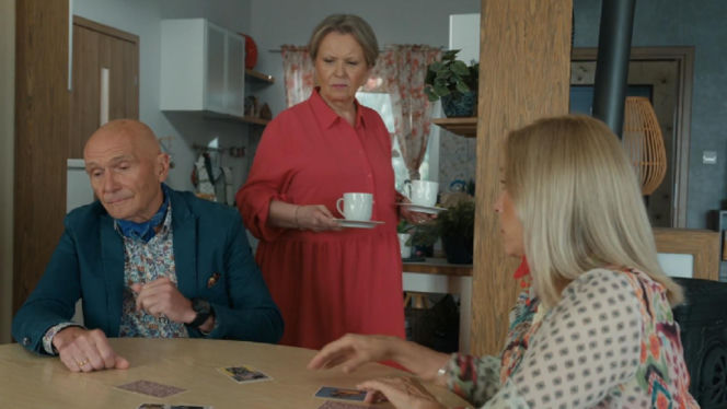 Aktorzy Marek Siudym (Tolek) i Małgorzata Potocka (Jola) przy stole z rozłożonymi kartami tarota, w tle Sławomira Łozińska (Basia) z tacą z filiżankami. Scena z serialu "Barwy szczęścia", której opis znajdziesz na Super Seriale.