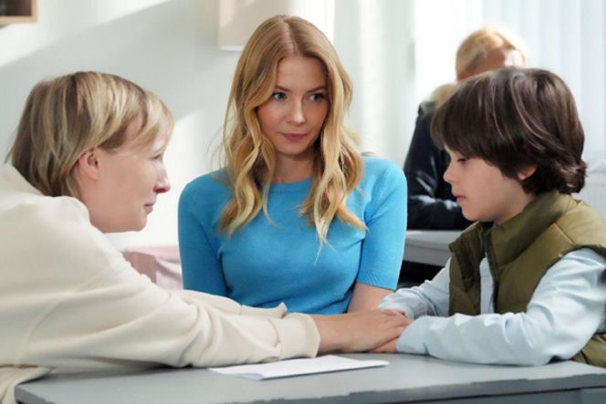 Kobieta (Weronika Nockowska) w jasnej bluzie trzyma dłoń chłopca (Filip Kowalewicz) w zielonej kamizelce, obok nich siedzi inna kobieta (Karolina Chapko) w niebieskim swetrze, patrząc w bok, co ilustruje dramatyczną sytuację w "Barwach szczęścia". Więcej o tym na Super Seriale.