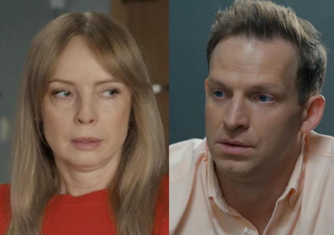 Katarzyna Tlałka jako Agnieszka i Michał Rolnicki jako Łukasz w serialu „Barwy szczęścia”. Agnieszka z opuszczonym wzrokiem i Łukasz ze złością w oczach, ich związek stoi na skraju rozpadu. Więcej informacji o serialu znajdziesz na Super Seriale.