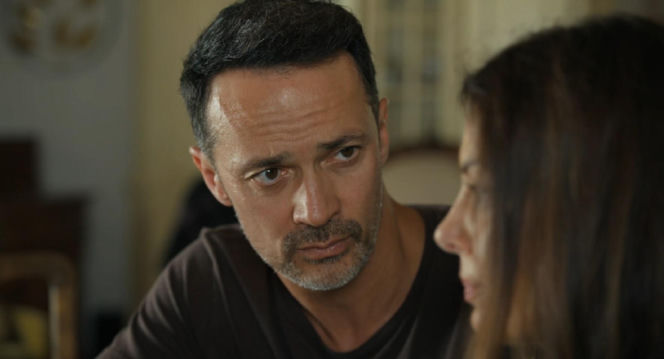 Aktor Rafał Cieszyński w roli Mariusza w serialu "Barwy szczęścia" rozmawia z Kasią, graną przez Katarzynę Glinkę. Mariusz ma zmartwioną minę. Scena dotyczy problemów w ich związku, o których można przeczytać na Super Seriale.