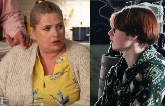 Aleks (Hubert Wiatrowski) w okularach uśmiecha się obok smutnej Aldony (Elżbieta Romanowska) w fioletowej kamizelce, przeżywającej rozczarowanie. Aleks nie wróci, co sprawi, że Aldona będzie martwić się o syna w serialu "Barwy szczęścia". Więcej o tym na Super Seriale.