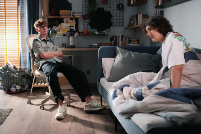 Aleks (Hubert Wiatrowski) w okularach, siedzący na krześle, ze skrzyżowanymi rękami, i Romeo (Jacek Tyszkiewicz) w białej koszulce, siedzący na łóżku, rozmawiający ze sobą w pokoju. Scena z serialu „Barwy szczęścia”, którą można zobaczyć na portalu Super Seriale.