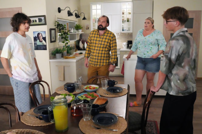 Trzech bohaterów serialu "Barwy szczęścia" stoi przy stole w kuchni. Od lewej Aleks (Hubert Wiatrowski) w koszulce tie-dye, Aldona (Elżbieta Romanowska) w kwiecistej bluzce i szortach, oraz Romeo (Jacek Tyszkiewicz) w ciemnej koszulce i okularach. Wszyscy wydają się zaskoczeni lub zmartwieni. Na stole śniadanie: sałatka, kanapki, sok. Ten kadr z pewnością zainteresuje fanów serialu "Super Seriale".