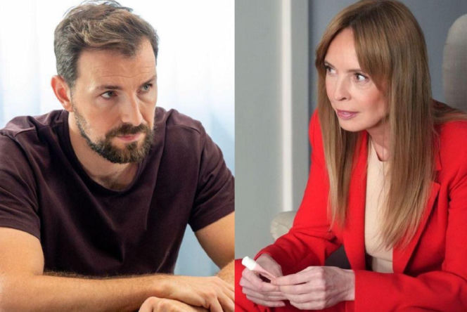 Łukasz Sadowski z brodą i wąsami, w ciemnej koszulce, z zamyśloną miną oraz Agnieszka Olszewska w czerwonej marynarce, trzymająca w dłoniach mały przedmiot. Zdjęcie ilustruje intrygi i dramatyczne wydarzenia z serialu "Barwy szczęścia" dostępne na stronie Super Seriale.