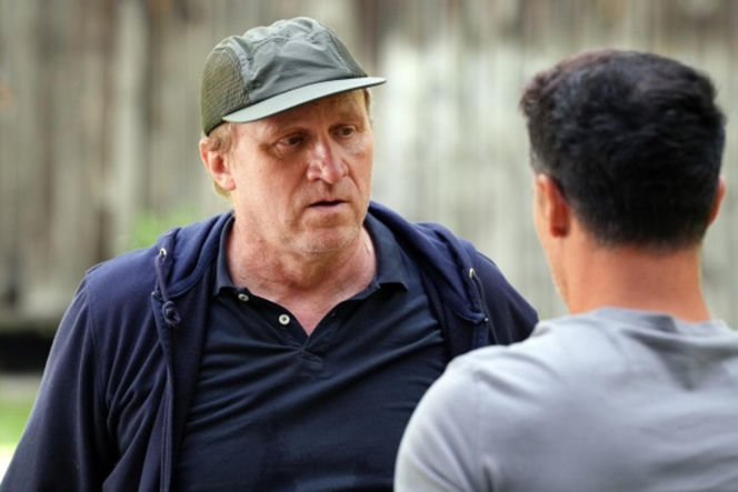 Rysiek Dąbrowski (Piotr Kazimierczak) w zielonej czapce i granatowej bluzie polo, rozmawia z Mariuszem Karpiukiem (Rafał Cieszyński) odwróconym tyłem w szarej koszulce. Ojciec Janki jest wściekły i oskarża Mariusza o uwiedzenie córki. Dramatyczne sceny z serialu "Barwy szczęścia" zobaczysz na Super Seriale.