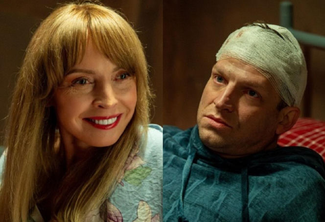 Agnieszka (Katarzyna Tlałka) z rudymi włosami, uśmiechnięta w jasnej bluzce, spogląda na przestraszonego Łukasza (Michał Rolnicki) w turkusowej bluzie, z zabandażowaną głową. Scena porwania z serialu "Barwy szczęścia", o którym więcej przeczytasz na Super Seriale.
