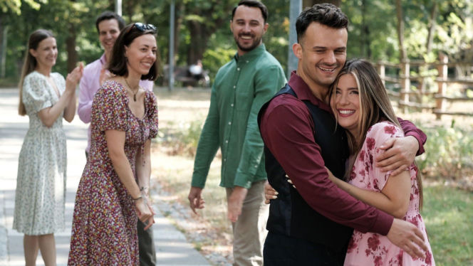 Ignacy (Olaf Staszkiewicz) i Agata (Natalia Zambrzycka) z serialu "Barwy szczęścia" obejmują się i uśmiechają na tle rozmytego parku. Pozostałe osoby w tle klaszczą, a jeden mężczyzna uśmiecha się. Więcej o ich losach na stronie Super Seriale.