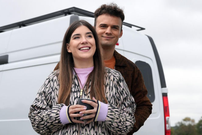 Agata Pyrka (Natalia Zambrzycka) uśmiecha się radośnie, trzymając kubek w dłoniach, a Ignacy Kieliszewski (Olaf Staszkiewicz) obejmuje ją od tyłu, oboje na tle białego vana. Para z serialu "Barwy szczęścia" planuje wspólne życie i powiększenie rodziny. Więcej na ten temat na Super Seriale.