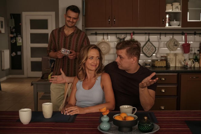 Aktorzy Anna Gzyra-Augustynowicz i Marek Molak jako Asia i Hubert Pyrka z serialu "Barwy szczęścia" siedzą przy stole, rozmawiając o problemach Iwony, podczas gdy w tle uśmiechnięty Emil trzyma w ręku grę. Więcej o dramatycznych wieściach w "Barwach szczęścia" znajdziesz na Super Seriale.