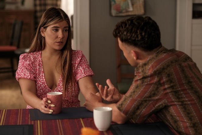 Agata (Natalia Zambrzycka) w różowej sukience z dekoltem i z kubkiem w dłoni, siedzi przy stole, rozmawiając z Ignacym (Olaf Staszkiewicz), którego widać z tyłu. Para dyskutuje, on gestykuluje dłońmi. Zdjęcie ilustruje kłótnię o wyprowadzkę Agaty i Ignacego, o której przeczytasz na Super Seriale.