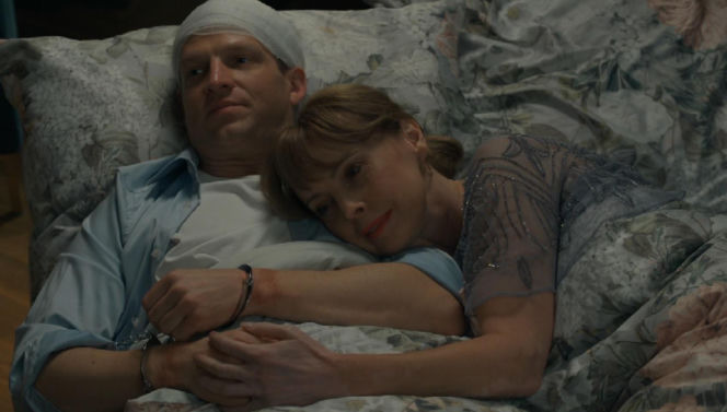 Mężczyzna z opatrunkiem na głowie, Łukasz (Michał Rolnicki), leży w łóżku obok kobiety, Agnieszki (Katarzyna Tlałka), która opiera głowę na jego ramieniu, a ich ręce są skute kajdankami. Oboje znajdują się pod wzorzystą pościelą. Więcej o ich losach w "Barwach szczęścia" przeczytasz na Super Seriale.
