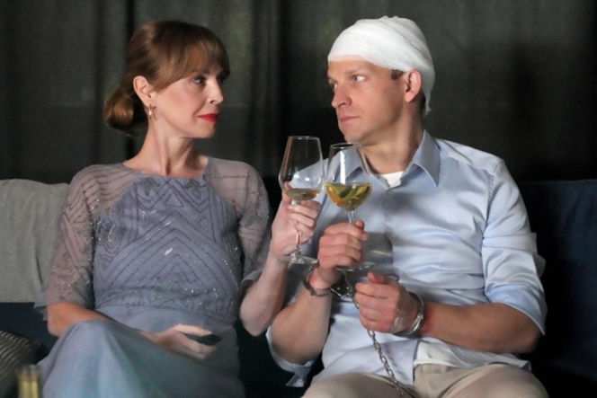 Katarzyna Tlałka jako Agnieszka i Michał Rolnicki jako Łukasz z serialu "Barwy szczęścia" w 3304 odcinku. Agnieszka w eleganckiej sukni i Łukasz z zabandażowaną głową, w kajdankach, trzymają kieliszki z winem. Więcej o ich losach na Super Seriale.