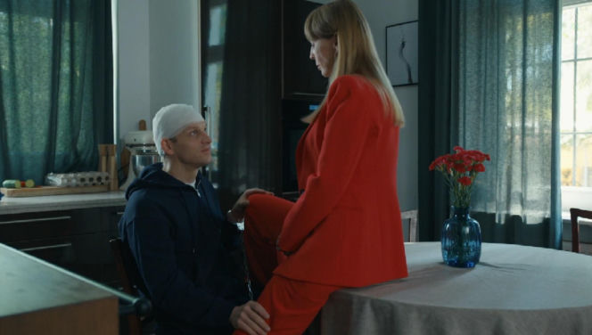 Michał Rolnicki jako Łukasz Sadowski z zabandażowaną głową i kajdankami na ręce, przykuty do blatu kuchennego. W tle kobieta w kwiecistej sukience. Scena z serialu "Barwy szczęścia", której opis znajdziesz na Super Seriale.