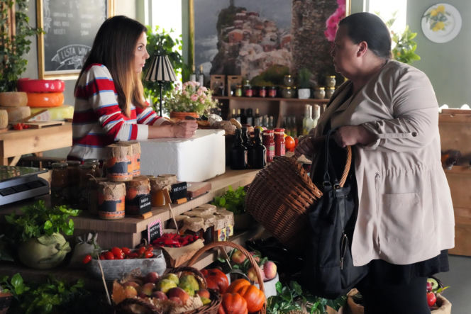 Kasia (Katarzyna Glinka) stoi za ladą sklepu, ubrana w pasiastą bluzkę, rozmawiając z Borowską (Dorota Piasecka), która trzyma wiklinowy koszyk i torbę. Na ladzie widać różnorodne przetwory, sery oraz świeże warzywa i owoce. To ważny moment w serialu "Barwy Szczęścia", o czym więcej przeczytasz na portalu Super Seriale.