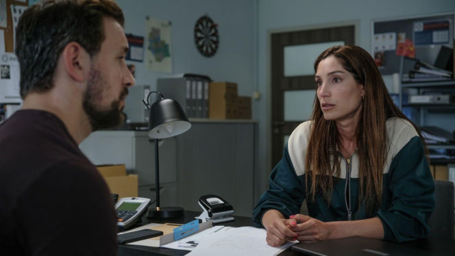 Celina (Orina Krajewska) i inspektor Kodur (Oskar Stoczyński) siedzą przy biurku, dyskutując o sprawie porwania Łukasza w "Barwach szczęścia". Celina, ubrana w sportową bluzę, zamyślona patrzy na policjanta. Więcej o ich śledztwie przeczytasz na Super Seriale.