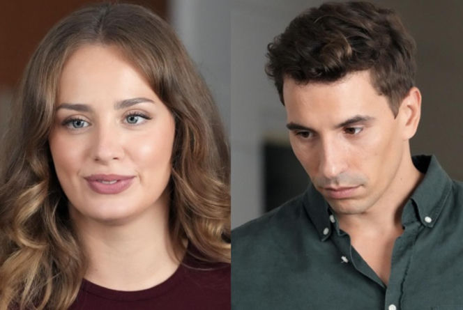 Uśmiechnięta Wiktoria Gąsiewska jako Oliwka oraz poważny Jakub Sokołowski jako Tomasz Kępski, patrzący w dół. Para z serialu "Barwy szczęścia" w odcinku 3314 zmaga się z konfliktem o dziecko. Więcej o ich losach na Super Seriale.