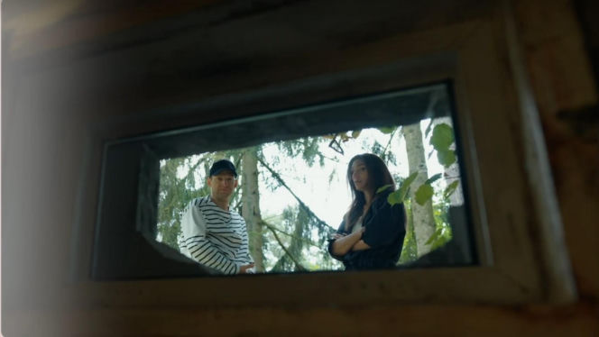 Michał Rolnicki jako Łukasz Sadowski i Orina Krajewska jako Celina Brońska stojący w lesie, widziani z wnętrza ciemnego pomieszczenia przez małe okno, co ilustruje powrót Łukasza do miejsca uwięzienia w "Barwach szczęścia". Więcej o serialu na Super Seriale.