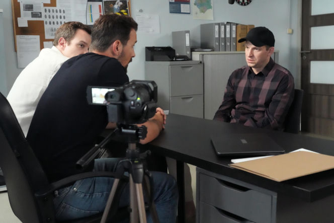 Trzech mężczyzn na komendzie policji. Dwóch z nich siedzi obok siebie, a naprzeciwko nich siedzi trzeci, który ma na sobie czapkę z daszkiem i koszulę w kratę, to najprawdopodobniej Michał Rolnicki (Łukasz) składający zeznania w serialu "Barwy Szczęścia", o czym przeczytasz więcej na Super Seriale.