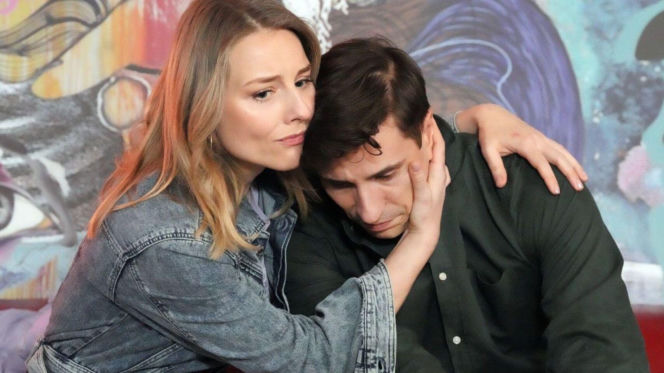 Blondwłosa Grażyna w jeansowej kurtce obejmuje smutnego Tomasza, pocieszając go. Mężczyzna ma ciemne włosy i koszulę, opiera głowę na dłoni kobiety. Na drugim planie widać kolorowe graffiti. Na portalu Super Seriale dowiesz się, czy Kępski wróci do Grażyny.