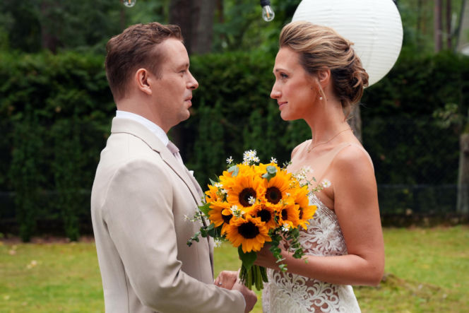 Para młoda, Asia i Hubert z serialu "Barwy szczęścia", patrzy na siebie w romantycznej scenerii ślubnej. Hubert w beżowym garniturze, Asia w koronkowej sukni, trzyma bukiet ze słoneczników. Zdjęcie ilustruje odcinek z wypadkiem na ślubie, o czym przeczytasz na Super Seriale.