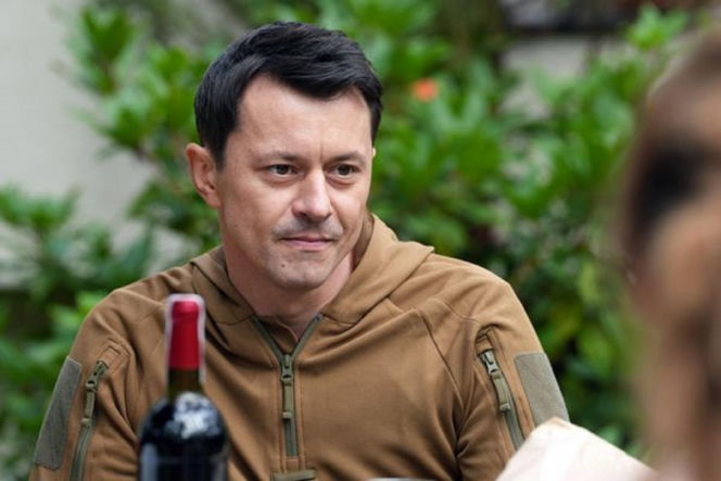 Mężczyzna o ciemnych włosach, Danek (Marcin Bikowski), w brązowej bluzie z kapturem, z butelką wina na pierwszym planie. Spojrzenie mężczyzny jest skierowane lekko w prawo, a tło stanowią rozmyte zielone liście. Zdjęcie ilustruje scenę z serialu "Barwy szczęścia", o której można przeczytać na Super Seriale.
