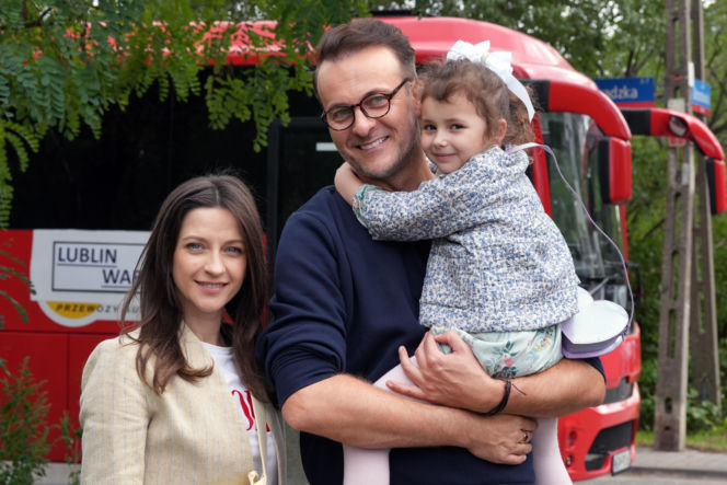 Uśmiechnięta kobieta, Izabela Gwizdak, uśmiechnięty mężczyzna, Łukasz Wójcik, trzymający na rękach małą dziewczynkę, Emilię Tkach, stojący na tle czerwonego autobusu i zielonych liści, co sugeruje powrót Radomira do rodziny w odcinku 3321 "Barw szczęścia". Więcej o losach bohaterów przeczytasz na Super Seriale.