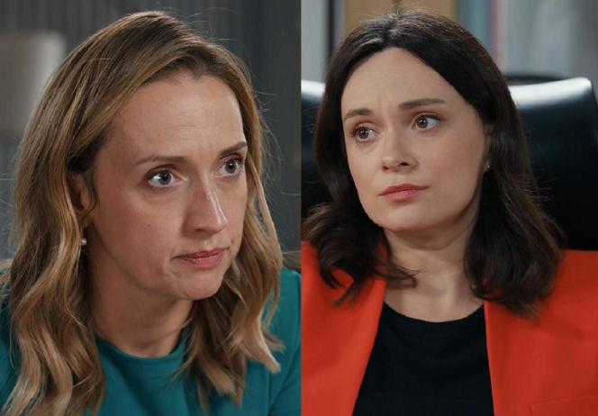 Dwie aktorki z serialu "Barwy szczęścia": Maria Dejmek jako Natalia i Anna Gzyra jako Asia. Kobiety spoglądają w tym samym kierunku z poważnymi minami. Więcej o ich losach na stronie Super Seriale.