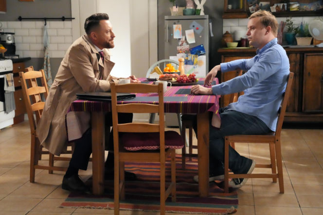 Marek Molak jako Hubert Pyrka, w jasnoniebieskiej koszuli i ciemnych jeansach, siedzi przy stole w kuchni i rozmawia z mężczyzną w beżowym płaszczu i garniturze. Na stole są owoce i kawa. Scena z serialu "Barwy szczęścia", której opis dostępny jest na portalu Super Seriale.