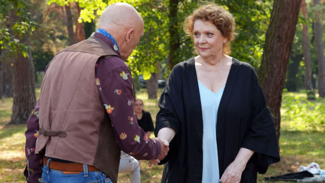 Józefina (Elżbieta Jarosik) i Tolek Koszyk (Marek Siudym) ściskają sobie dłonie w parku, patrząc na siebie. Józefina ma na sobie czarny luźny kardigan i błękitną bluzkę, a Tolek koszulę w kwiatowy wzór i brązową kamizelkę. Nowe odcinki "Barw szczęścia" znajdziesz na Super Seriale.