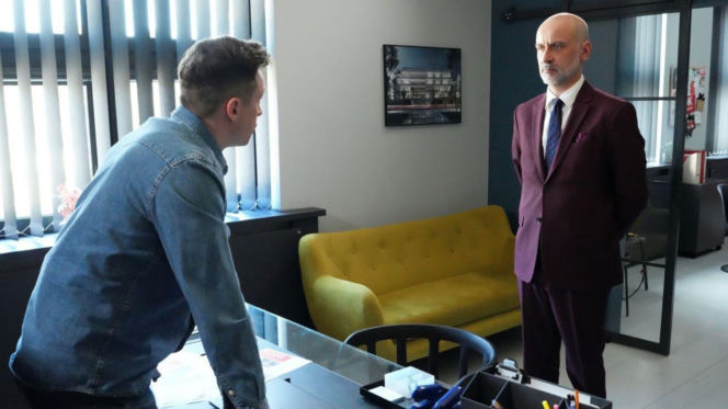 Kornel (Jakub Bohosiewicz) w bordowym garniturze stoi naprzeciw Modrzyckiego (Piotr Ligineza) w jeansowej koszuli, pochylonego nad biurkiem. Widoczny w tle żółty fotel i regał. Więcej o ich losach na Super Seriale.