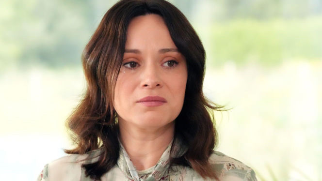Zbliżenie na zapłakaną Natalię (Maria Dejmek) z serialu "Barwy szczęścia", której spływająca łza na policzku symbolizuje smutek i trudne chwile po aresztowaniu Cezarego. Koniec ich związku to gorący temat na Super Seriale.