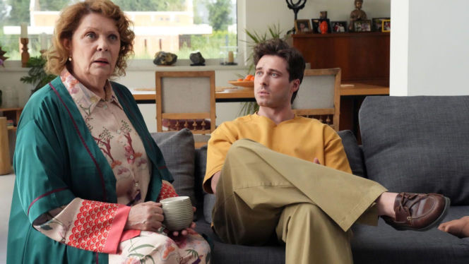 Józefina (Elżbieta Jarosik) z zatroskaną miną siedzi na kanapie obok Cezarego (Marcel Opaliński), który ma na sobie żółtą koszulkę i beżowe spodnie. Kobieta trzyma w ręku kubek, patrząc przed siebie. Obraz z serialu "Barwy szczęścia" można zobaczyć na Super Seriale.