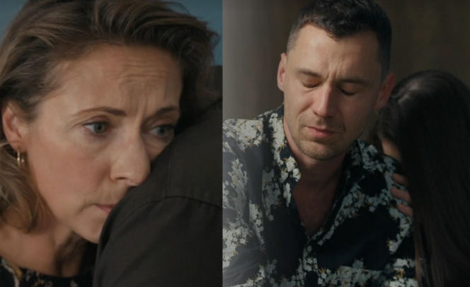 Smutna Gabrysia (Marta Juras) przytula Darka (Andrzej Niemyt), który ma zamknięte oczy i pogrążony jest w żałobie po śmierci Karola w serialu "Barwy szczęścia". Scena pełna emocji i wsparcia w trudnych chwilach. Więcej o losach bohaterów przeczytasz na stronie Super Seriale.