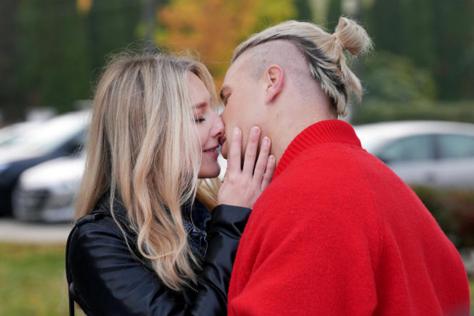Para zakochanych, Grażyna i Patryk z serialu "Barwy szczęścia", całuje się na tle jesiennych drzew i samochodów. Blondwłosa kobieta w czarnej ramonesce dotyka dłonią twarzy mężczyzny w czerwonym swetrze i z irokezem. Więcej o ich losach na Super Seriale.