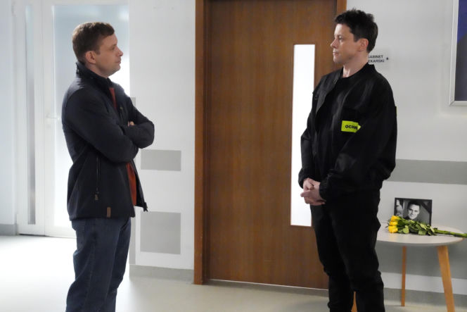 Hubert (Marek Molak) i Daniel (Marcin Bikowski) rozmawiają w szpitalu. Hubert, ubrany w granatową kurtkę, stoi z założonymi rękami, a Daniel w stroju ochroniarza z napisem "OCHR" na ramieniu, ma złożone dłonie. Artykuł o serialu "Barwy szczęścia" i innych produkcjach na stronie Super Seriale.