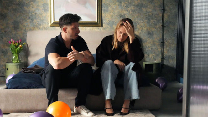 Justin (Jasper Sołtysiewicz) i Ola (Michalina Robakiewicz) stoją obok siebie w kuchni, rozmawiając z poważnymi minami. Justin, w granatowej koszulce polo, spogląda na bok, podczas gdy Ola, w ciemnym płaszczu i z rozpuszczonymi włosami, patrzy w jego kierunku. Para mierzy się z problemami w związku. Więcej na ten temat znajdziesz na Super Seriale.