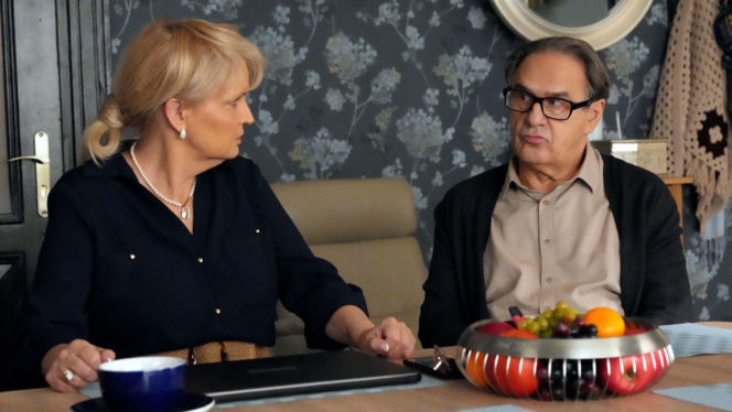 Małgorzata (Adrianna Biedrzyńska) w granatowej koszuli z perłowym naszyjnikiem i Jerzy (Bronisław Wrocławski) w beżowej koszuli i okularach na zdjęciu z artykułu o "Barwach szczęścia". Konflikt bohaterów, o którym przeczytasz na portalu Super Seriale.