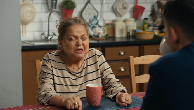 Starsza kobieta, Lucyna (Grażyna Zielińska), w paski bluzce siedzi przy stole z zaciśniętymi pięściami i marszczy twarz w złości, naprzeciwko niej widać plecy Ignacego. Scena z serialu "Barwy szczęścia", której opis znajdziesz na Super Seriale.