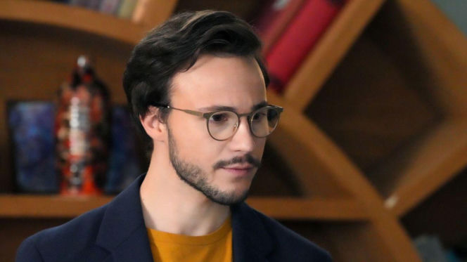 Młody mężczyzna, Jakub Dmochowski jako Kajtek w serialu „Barwy szczęścia”, z krótką brodą i okularami, ubrany w żółtą koszulkę i granatową marynarkę, patrzący w bok z zamyślonym wyrazem twarzy na tle drewnianego regału. Więcej o wątku Karoliny i Kajtka znajdziesz na Super Seriale.