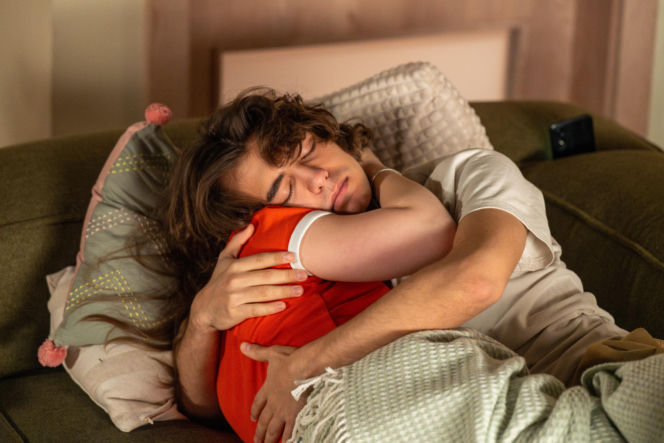 Mężczyzna o kręconych włosach obejmuje kobietę w czerwonej bluzce, leżąc na zielonej kanapie pod pledem, obok poduszki i telefonu. Scena odzwierciedla intymne chwile Ewy i Romeo z serialu "Barwy szczęścia", o których przeczytasz więcej na Super Seriale.