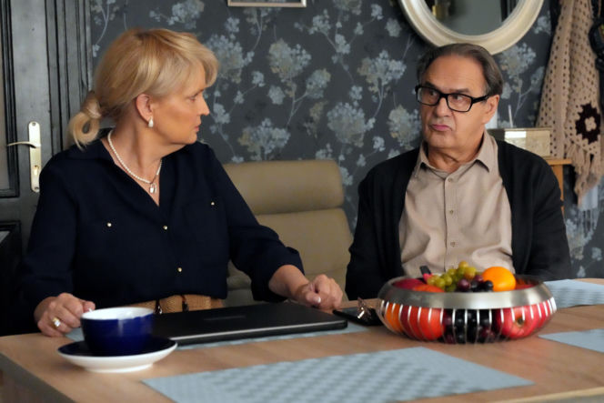 Małgorzata (Adrianna Biedrzyńska) i Jerzy (Bronisław Wrocławski) siedzą przy stole. Małgorzata ma na sobie granatową koszulę i naszyjnik z pereł, Jerzy beżową koszulę i czarny sweter, spogląda z dezaprobatą. Obrazek oddaje emocje związane z serialem "Barwy szczęścia" i dostępne są jego fragmenty na Super Seriale.